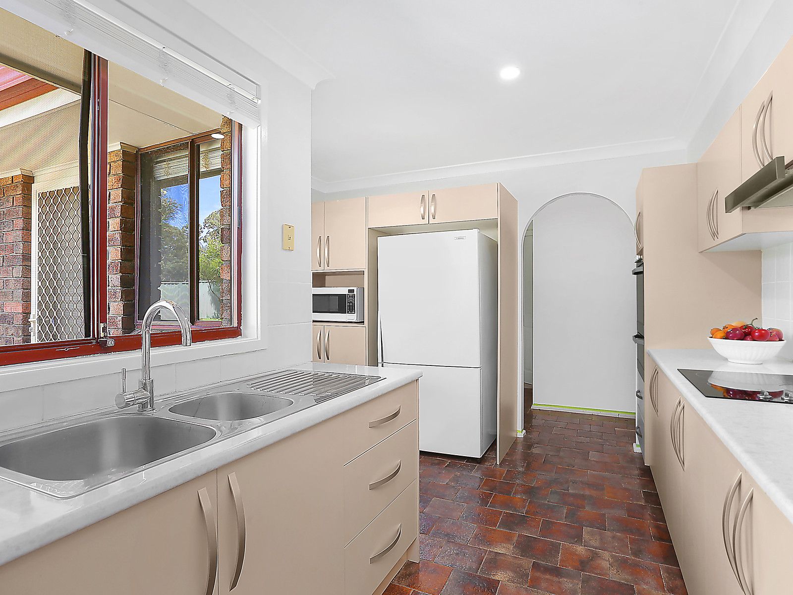 - Central kitchen with electric cooktop, plenty of storage