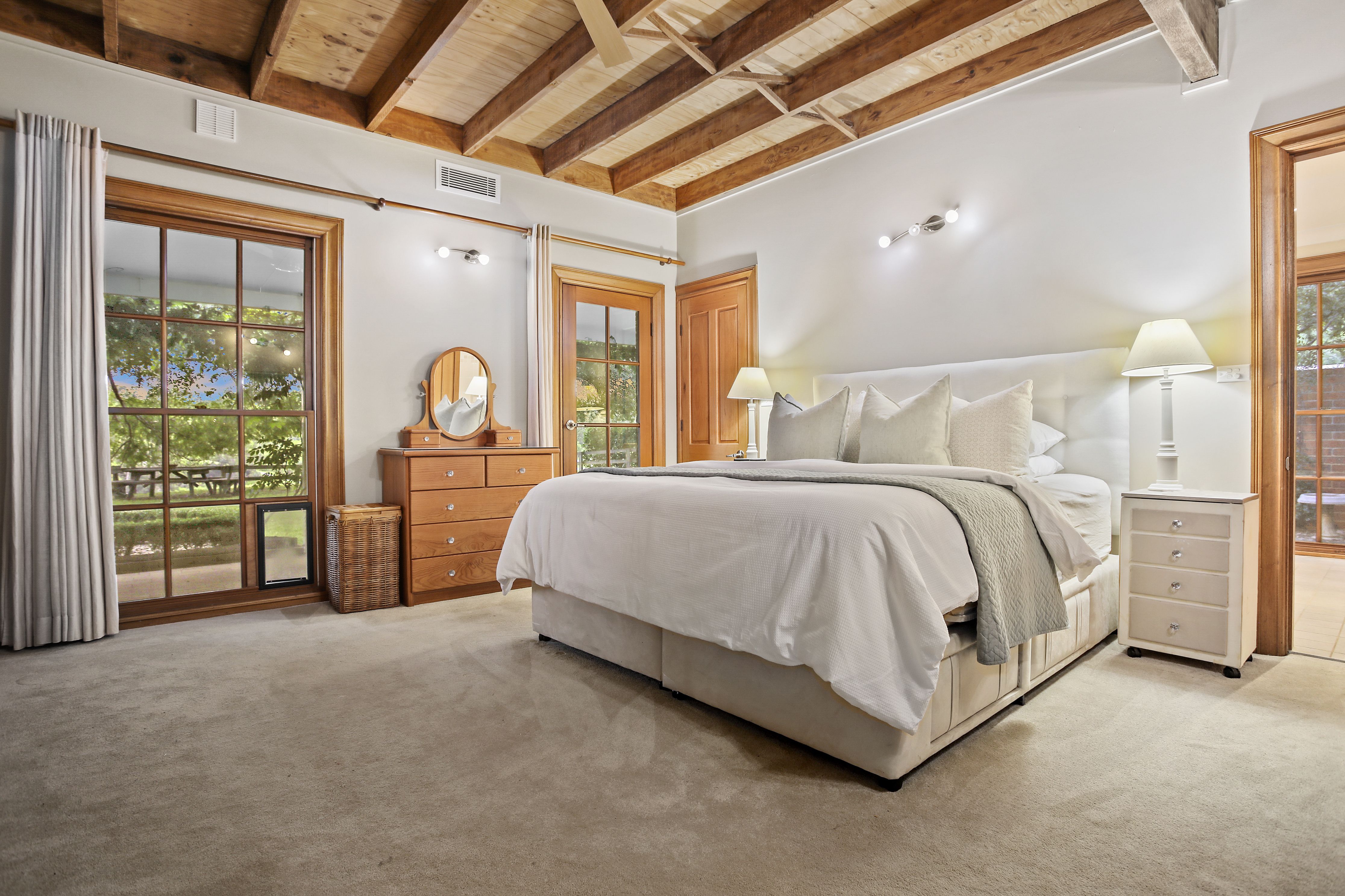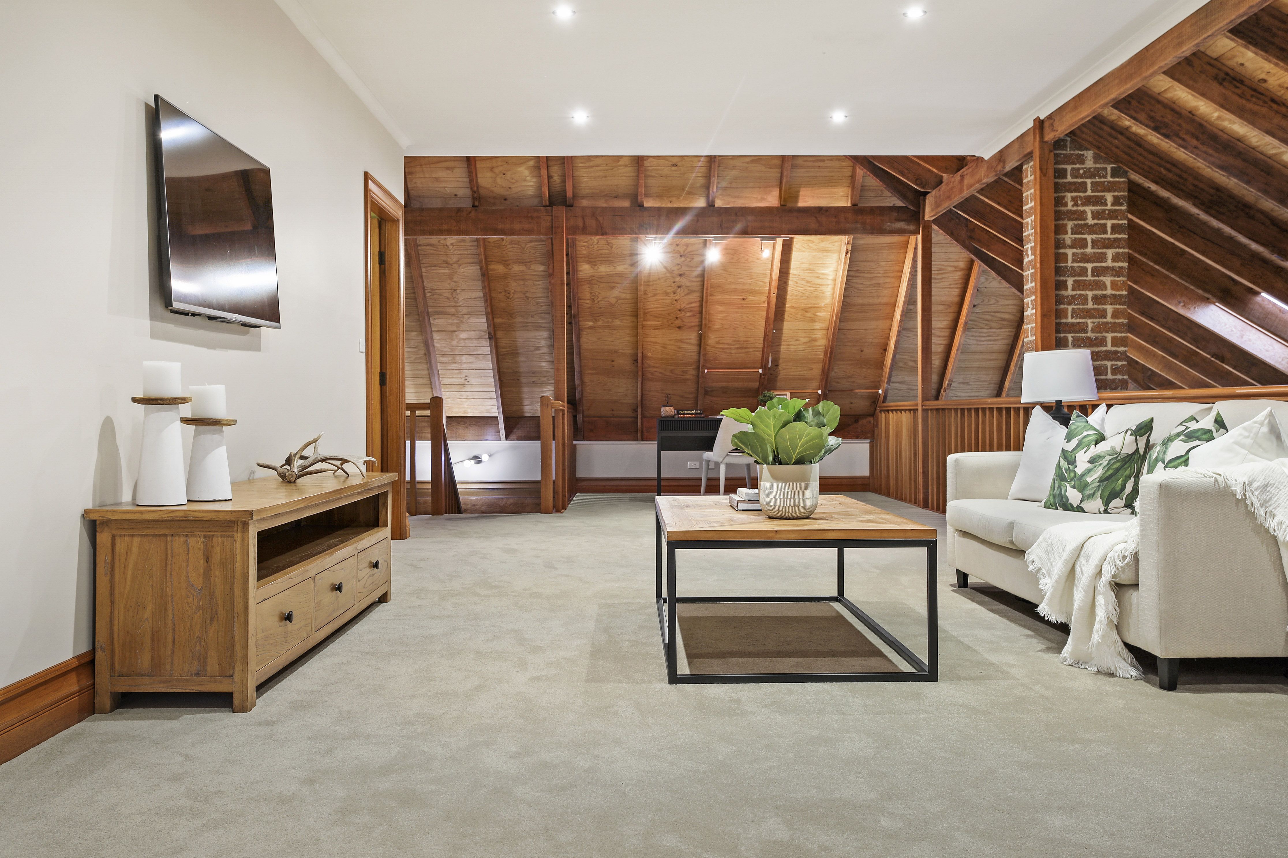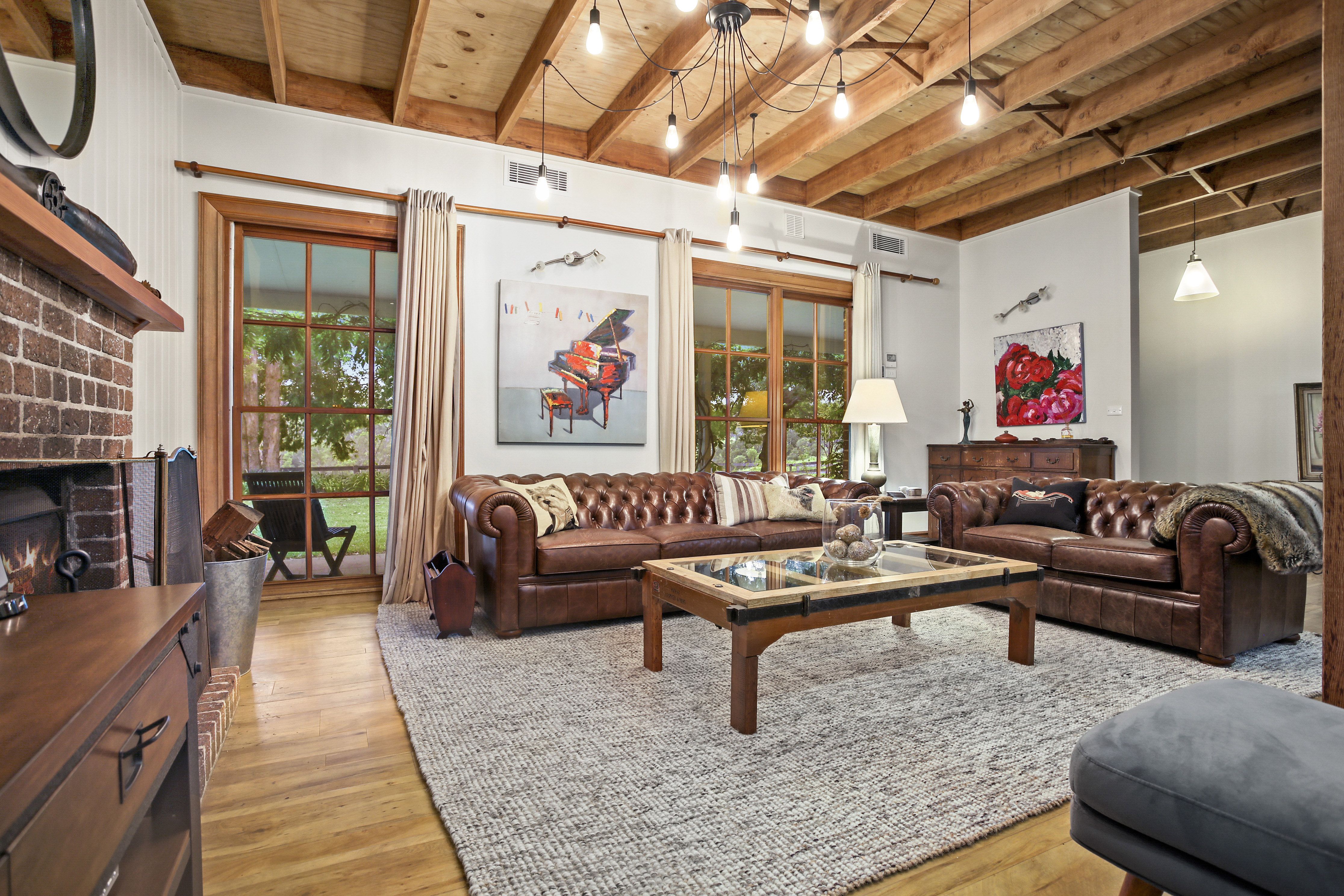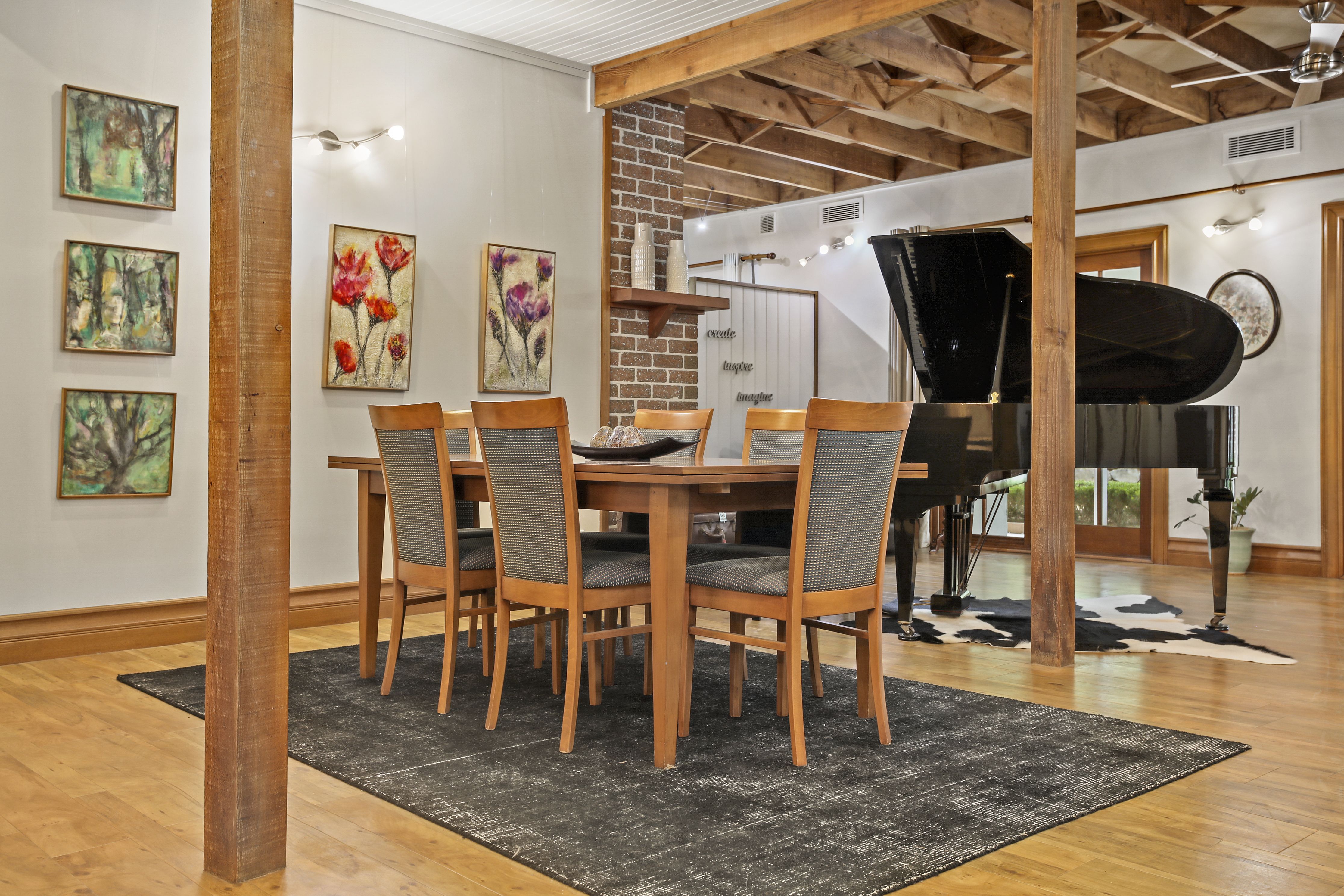 - Soaring ceilings with exposed timber beams and void area connects the two levels
