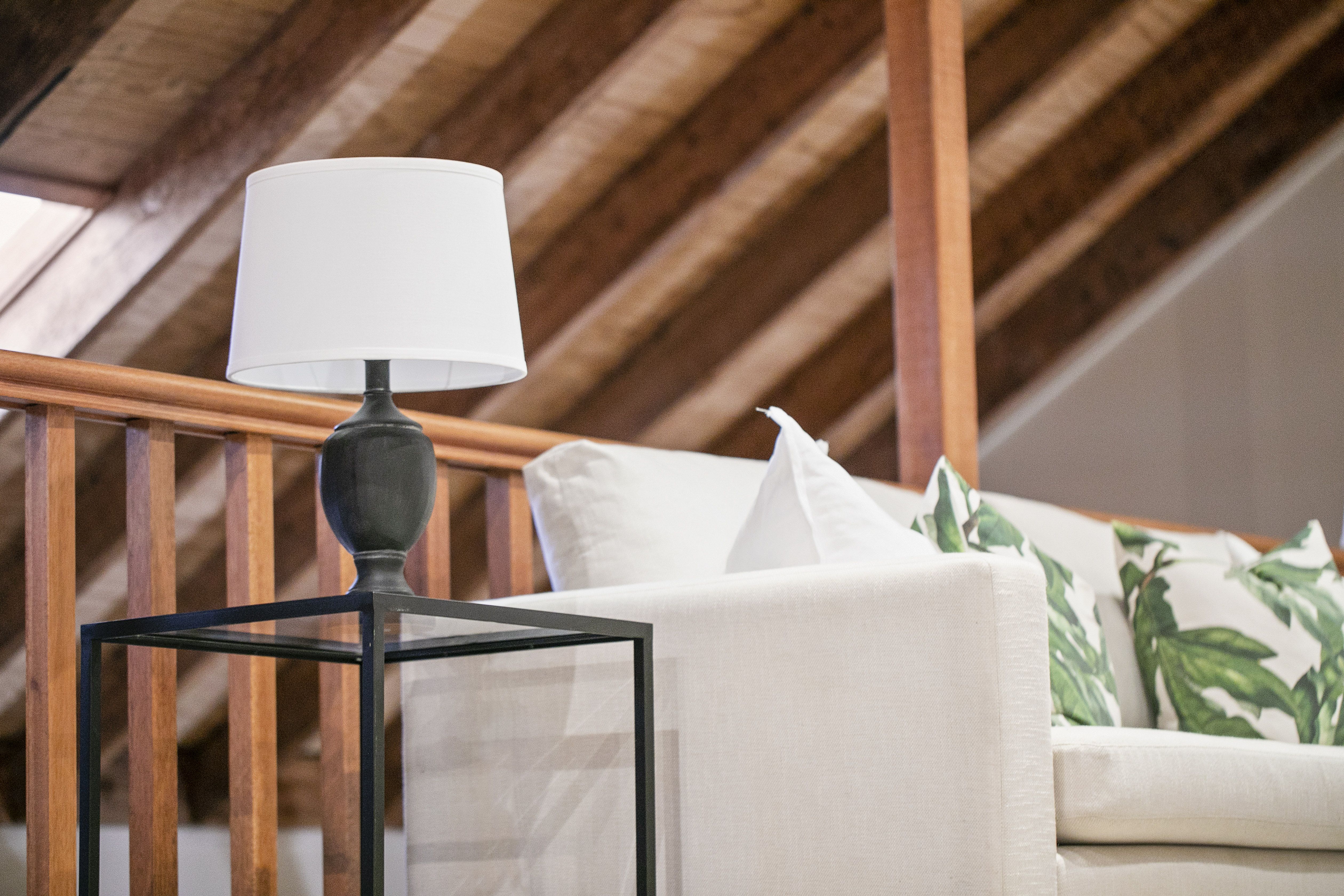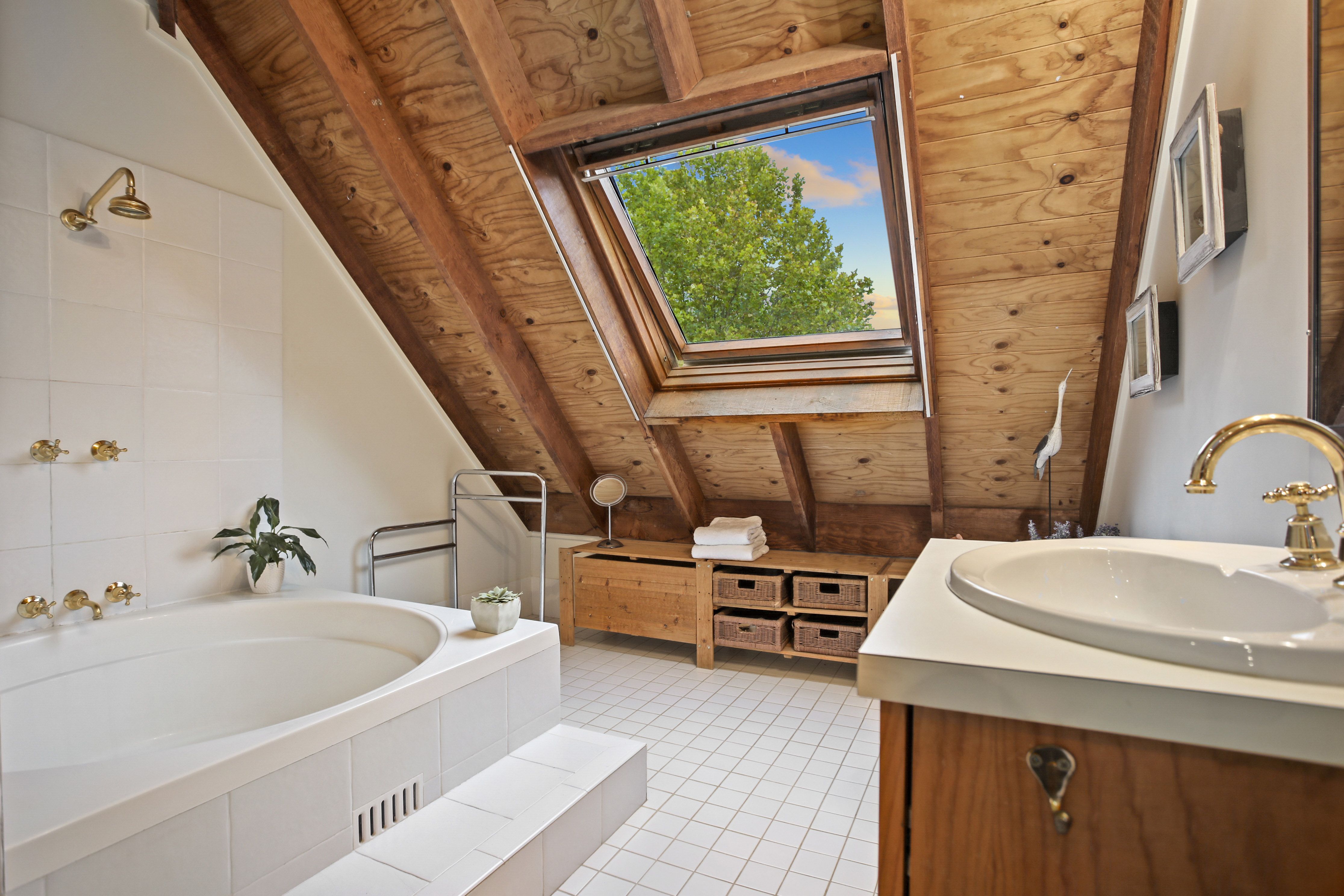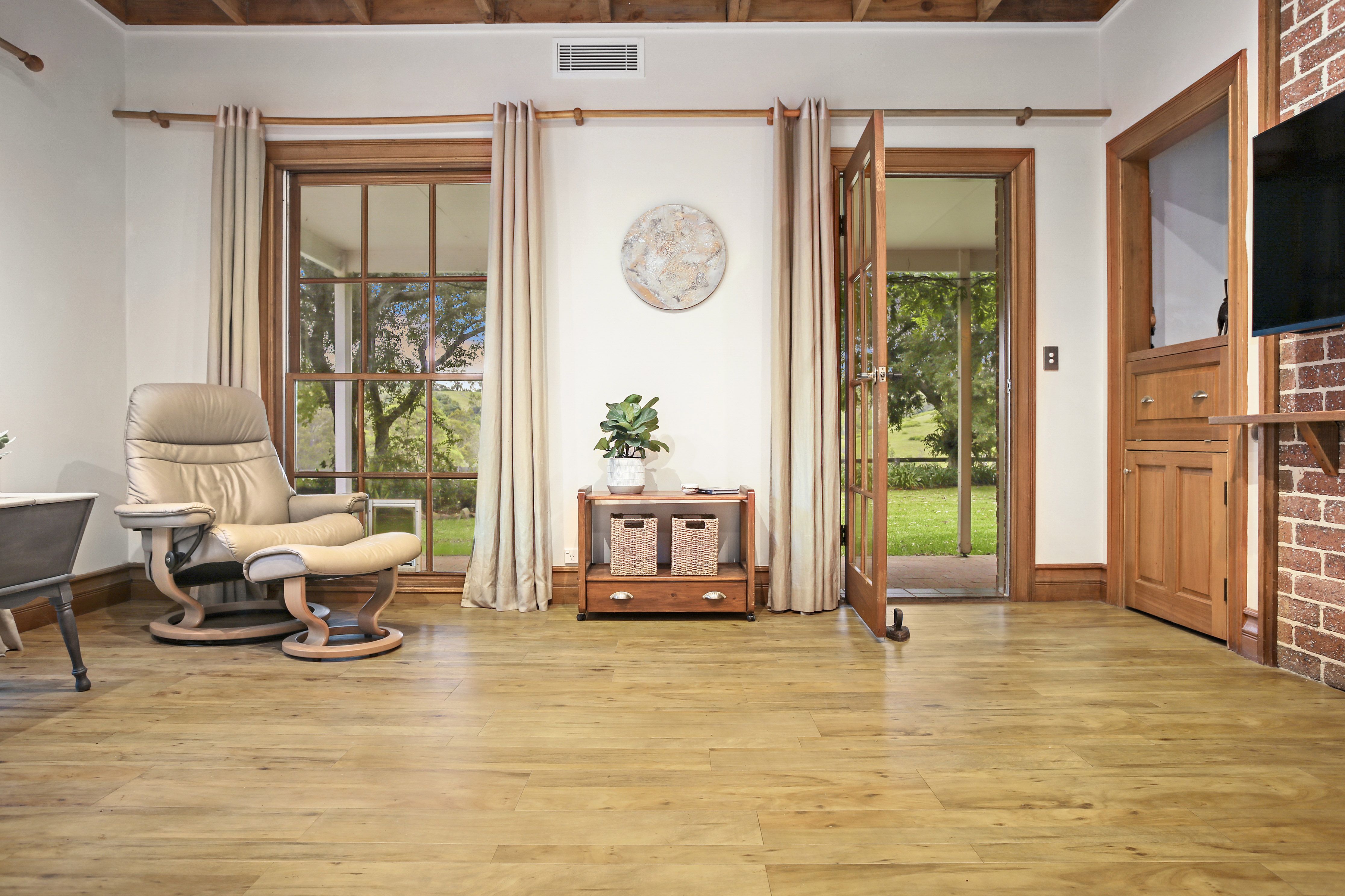 - Soaring ceilings with exposed timber beams and void area connects the two levels