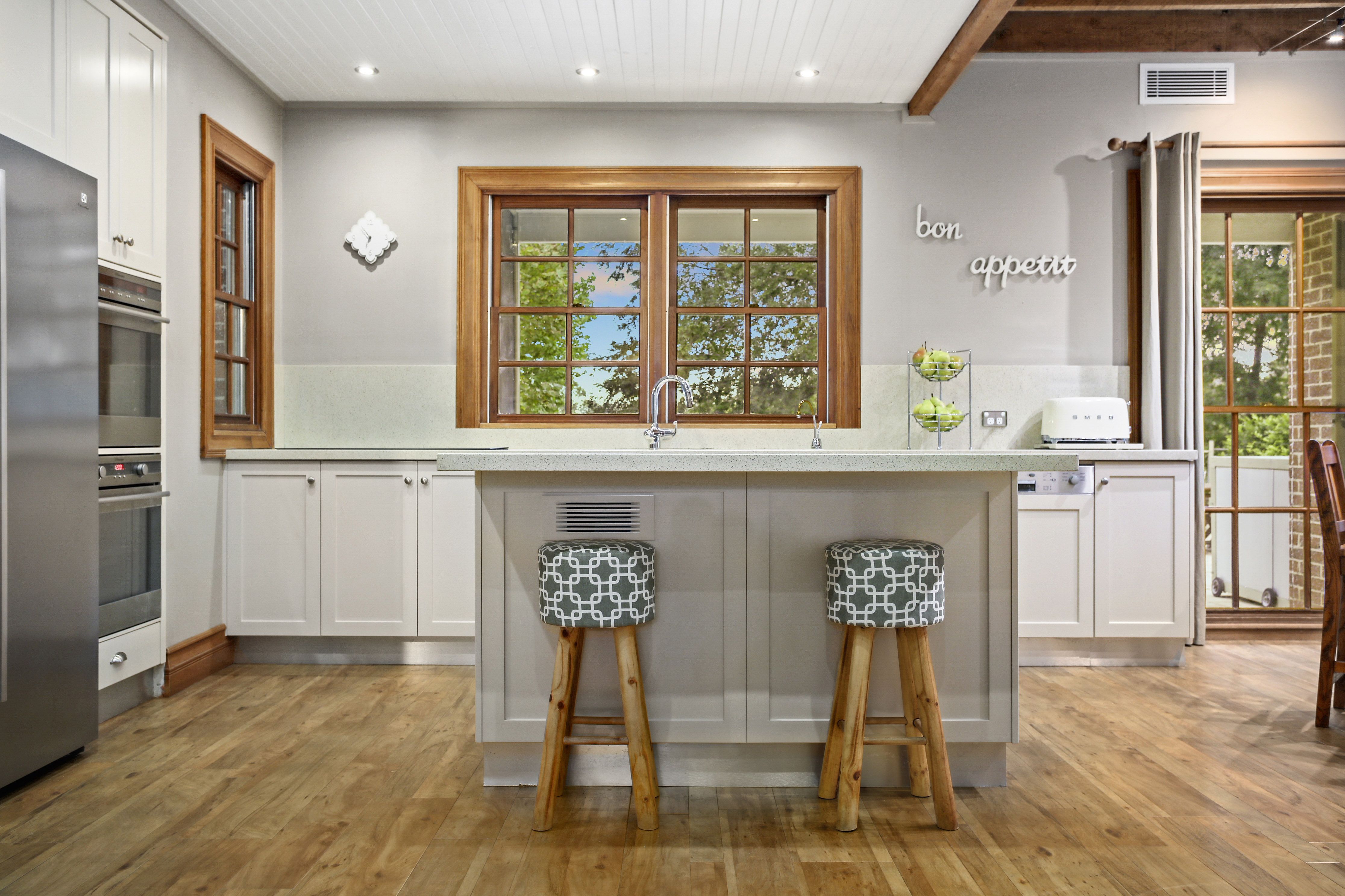 - Modern CaesarStone kitchen has an induction cooking, dual ovens and walk-in pantry
