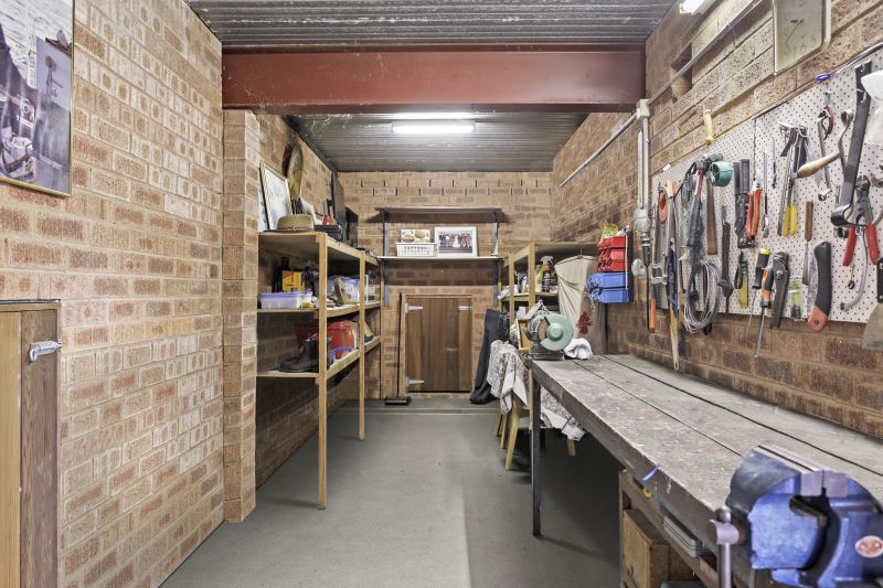 - Private single garage with adjoining workshop and internal storage