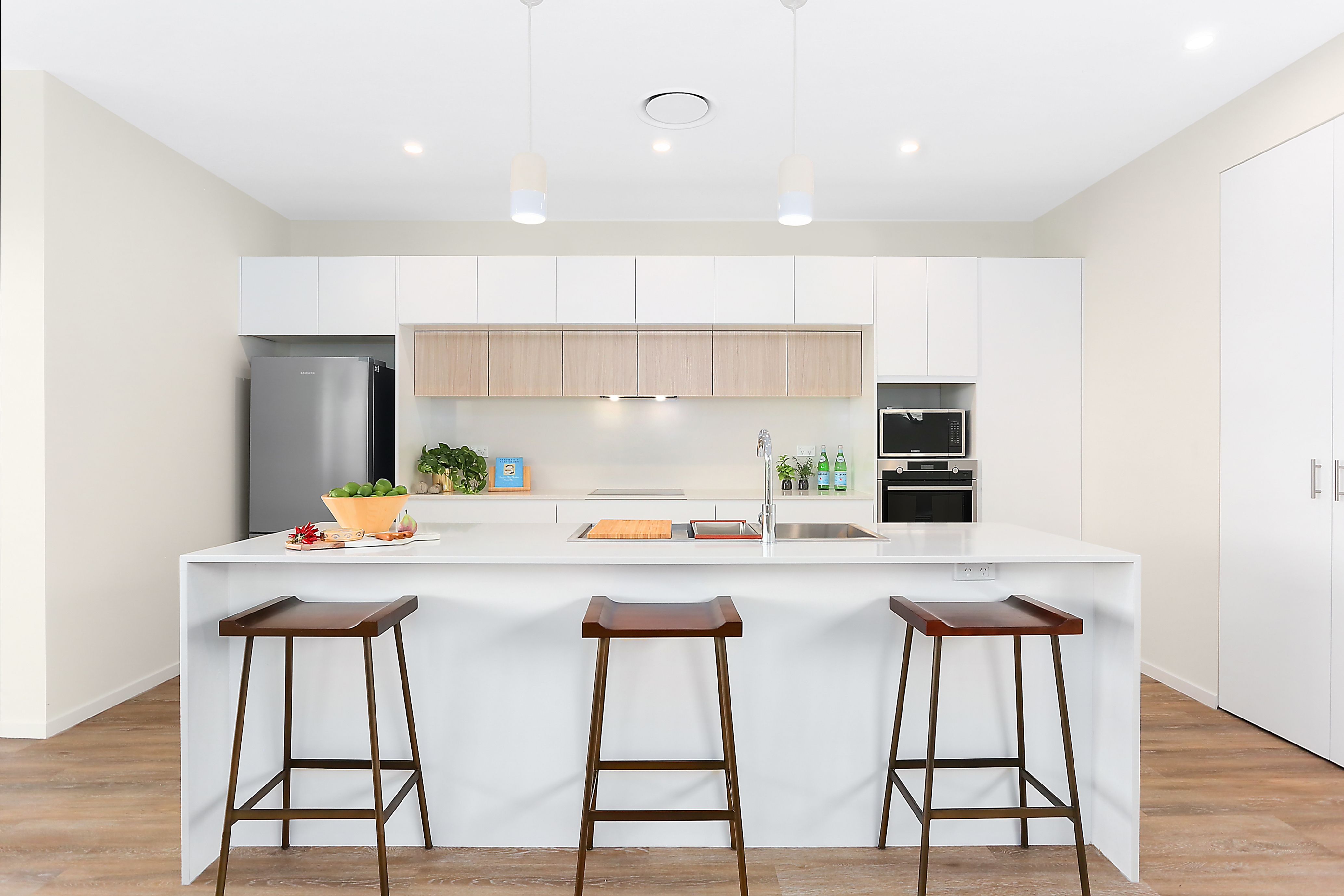 - A designer kitchen, with premium stone benchtops and appliances